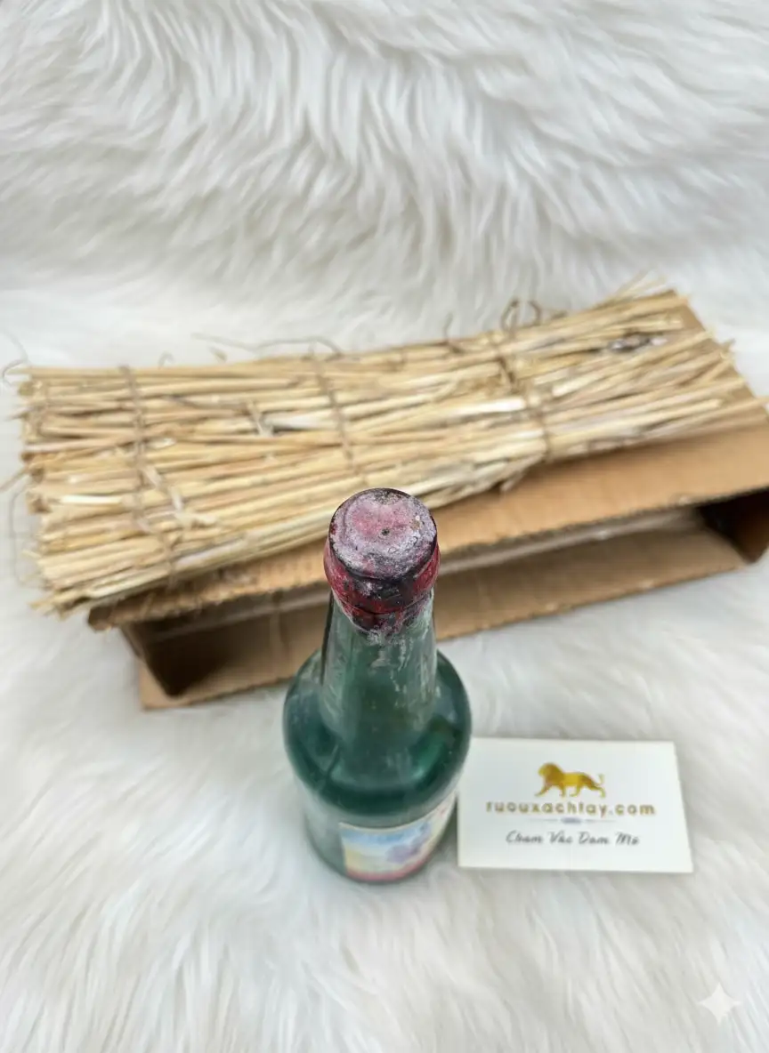 - Dấu niêm phong bằng sáp ở miệng chai đã chuyển màu theo thời gian, phản ánh quá trình oxi hóa tự nhiên suốt hơn nửa thế kỷ.